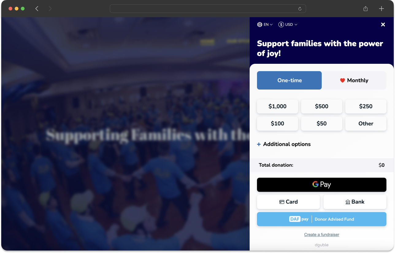 Chariot Connect (DAFpay button) comes as a small JavaScript package. It can be loaded directly from the Chariot CDN or installed via NPM or Yarn. When loading from the CDN, it must always be loaded directly from https://cdn.givechariot.com, rather than included in a bundle or hosted yourself.