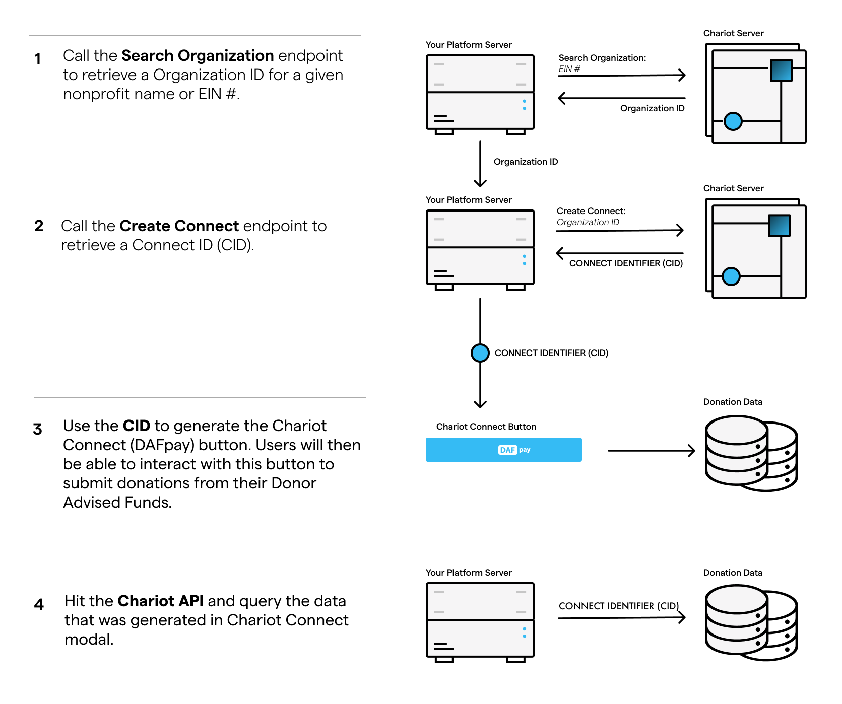 The initial step involves searching Chariot’s database for an organization and creating a Connect. Once created, you will receive a Connect ID (CID) that can be used to initialize Chariot Connect, the web component that renders the DAFpay button. Lastly, query Chariot’s APIs to gather all the data generated through Connect.