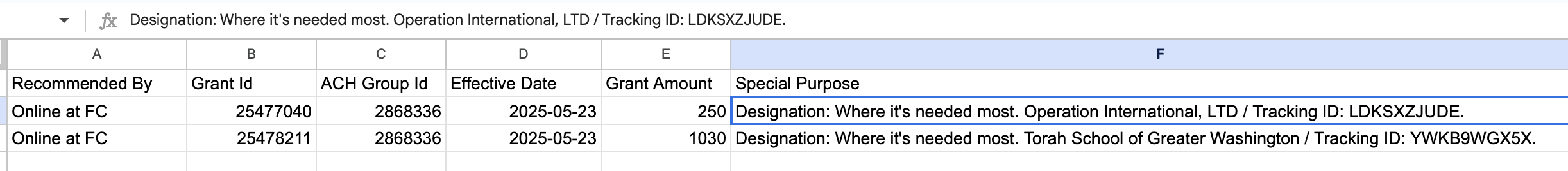 - Tracking ID: A 10-digit alphanumeric identifier generated by DAFpay, included in the initial grant request, and usually passed to the nonprofit from the DAF. This appears in the DAF provider’s data as a “Tracking ID:” string within the grant note or purpose.